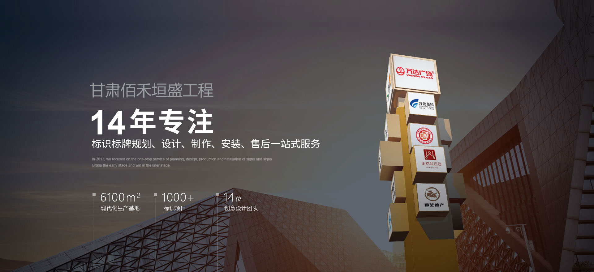 甘肃佰禾垣盛工程有限公司是现代标识(导视)行业集规划设计、方案解决、生产制造、销售服务为一体的领先企业。拥有行业一流的高新设备及专业生产车间,实现了标识标牌产品生产制造的专业化、标准化、模块化服务。近年来更是突出了我们的核心竞争力—以“极致追求、匠心工艺”为高要求客户提供定制化服务、以期全方位满足标识标牌行业客户的全面需求。....